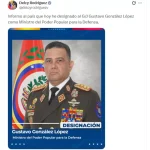 El nuevo ministro de Defensa, Gustavo González López, se desempeña como comandante general de la Guardia de Honor Presidencial desde el 6 de enero, cuando fue designado por Rodríguez. Desde esa misma fecha también fue designado jefe de la Dirección de Contrainteligencia Militar (DGCIM).