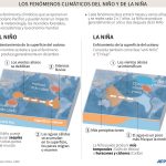 Explicación infográfica de El Niño y La Niña, dos fenómenos climáticos opuestos en el Océano Pacífico que pueden tener un impacto significativo en la meteorología, los incendios forestales y los ecosistemas – (AFP)