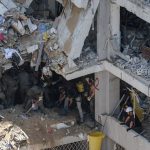 Hay trabajadores de rescate, bajo los escombros de edificios destruidos, que buscan personas desaparecidas.