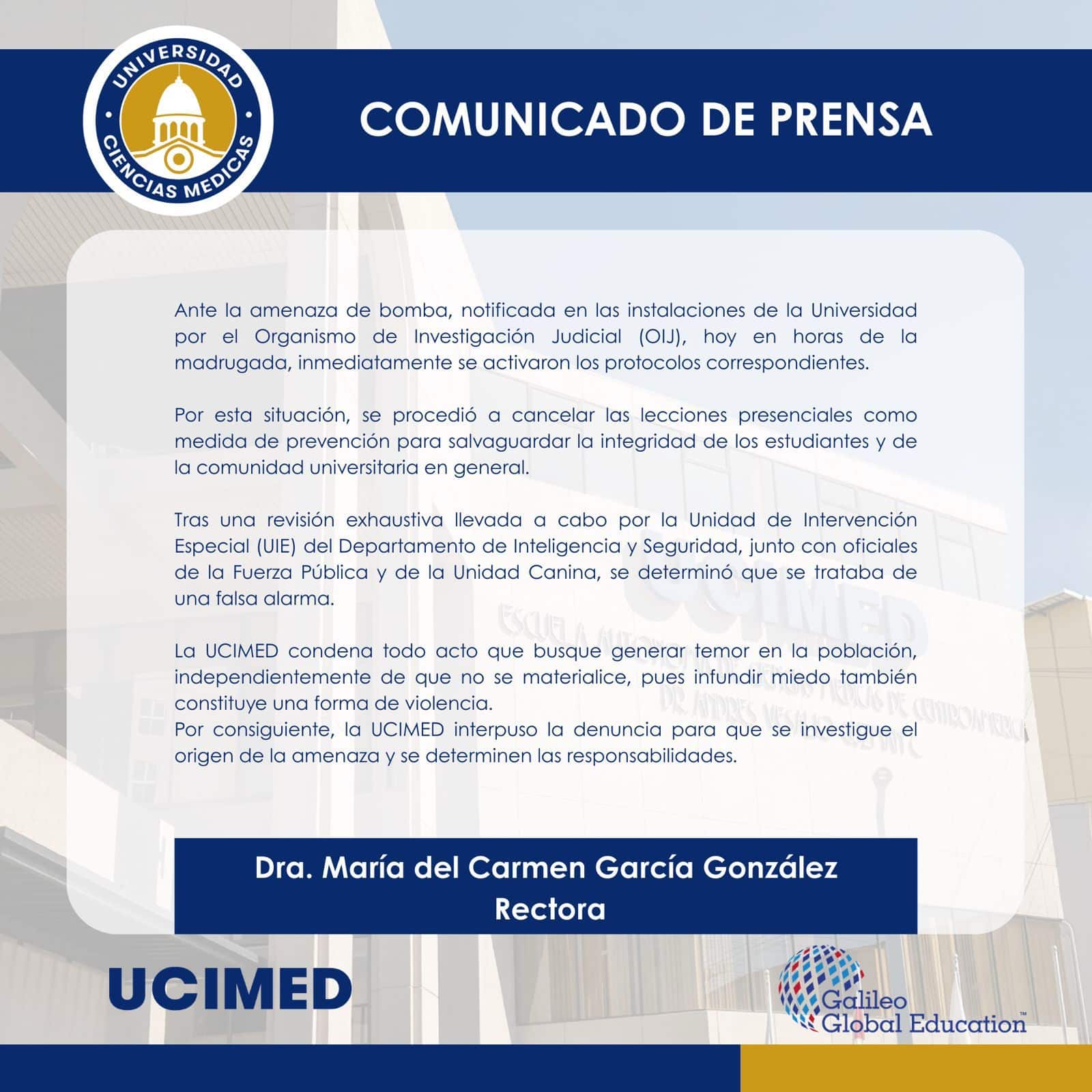 «Ante la amenaza de bomba, que fue notificada en la madrugada de hoy en las instalaciones de la Universidad por el Organismo de Investigación Judicial (OIJ), de inmediato se activaron los protocolos correspondientes.